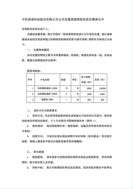 中机美诺科技股份有限公司公开处置报废物资的竞价邀请公示